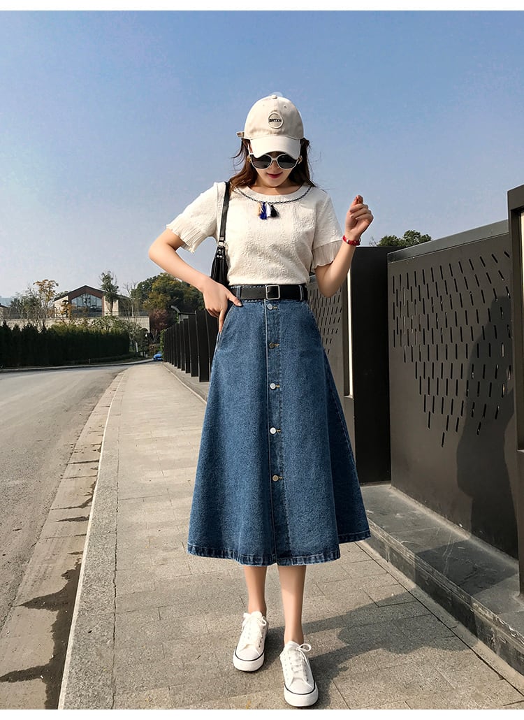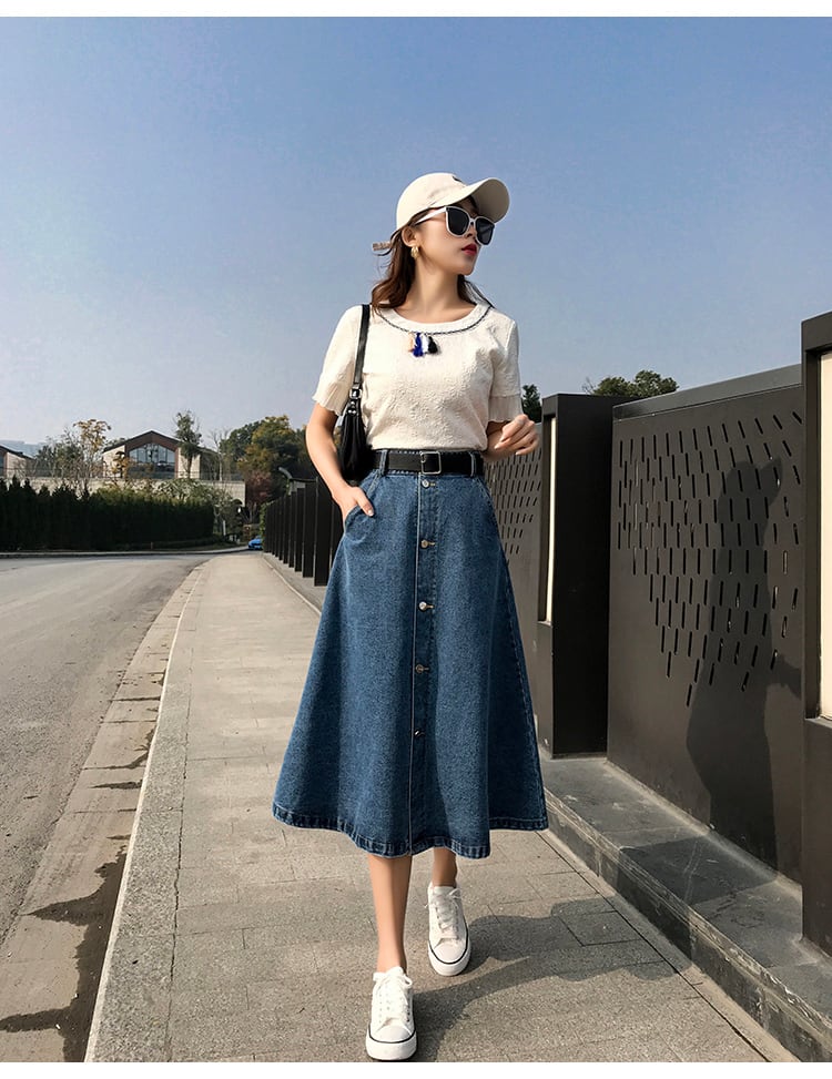 カジュアルなAラインのデニムスカート。夏らしさを感じさせてくれるデザインで夏のカジュアルなコーデが楽しめる。