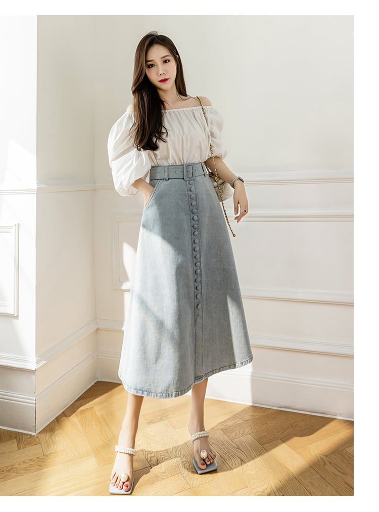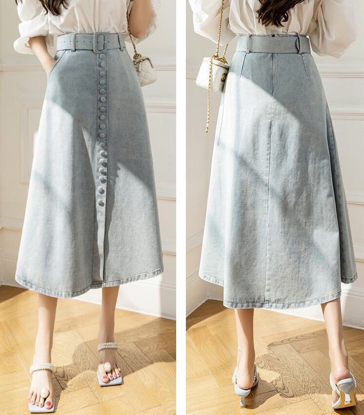 ワードスカート シングルブレスト スカート ボトムス デニムスカート ミモレ ミモレ丈 ストレート Aライン ベルト ウエストマーク ハイウエスト 大人可愛い カジュアル 大人 上品 おしゃれ お洒落 レトロ 大人女子 クール 無地 春 10代 20代 レディース 女性用 デート お出かけ 女子会 お泊まり 休日 イベント 普段使い ファッション コーデ スタイル サイズ S M L XL 青 ブルー ライトブルー