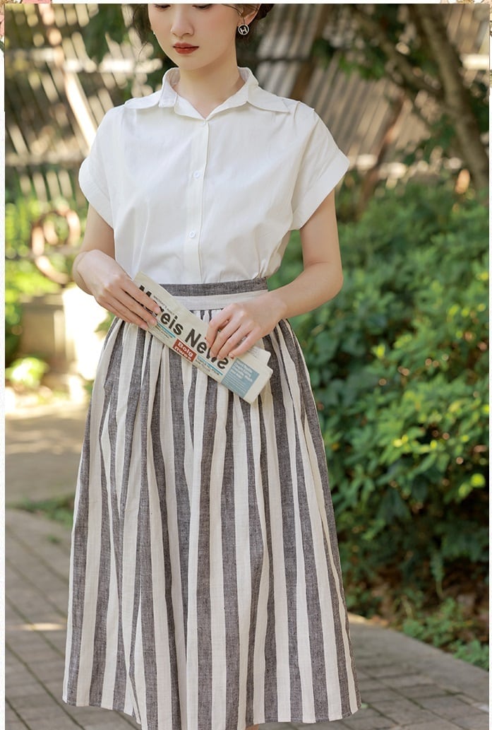 セットアップ ブラウス フレアスカート 2点セット 膝下 ミモレ ミモレ丈 袖あり フレンチスリーブ 襟付き フレア Aライン 裾イン ファスナー ハイウエスト ボタン 薄手 かわいい 大人可愛い カジュアル おしゃれ お洒落 レトロ ラフ キュート ガーリー 無地 ストライプ 春 夏 10代 20代 30代 40代 50代 レディース 学生 通学 デート お出かけ 女子会 休日 アウトドア リゾート 旅行 ショッピング 着回し 普段使い 重ね着 S M L ゆったり ホワイト ブルー ブラウン