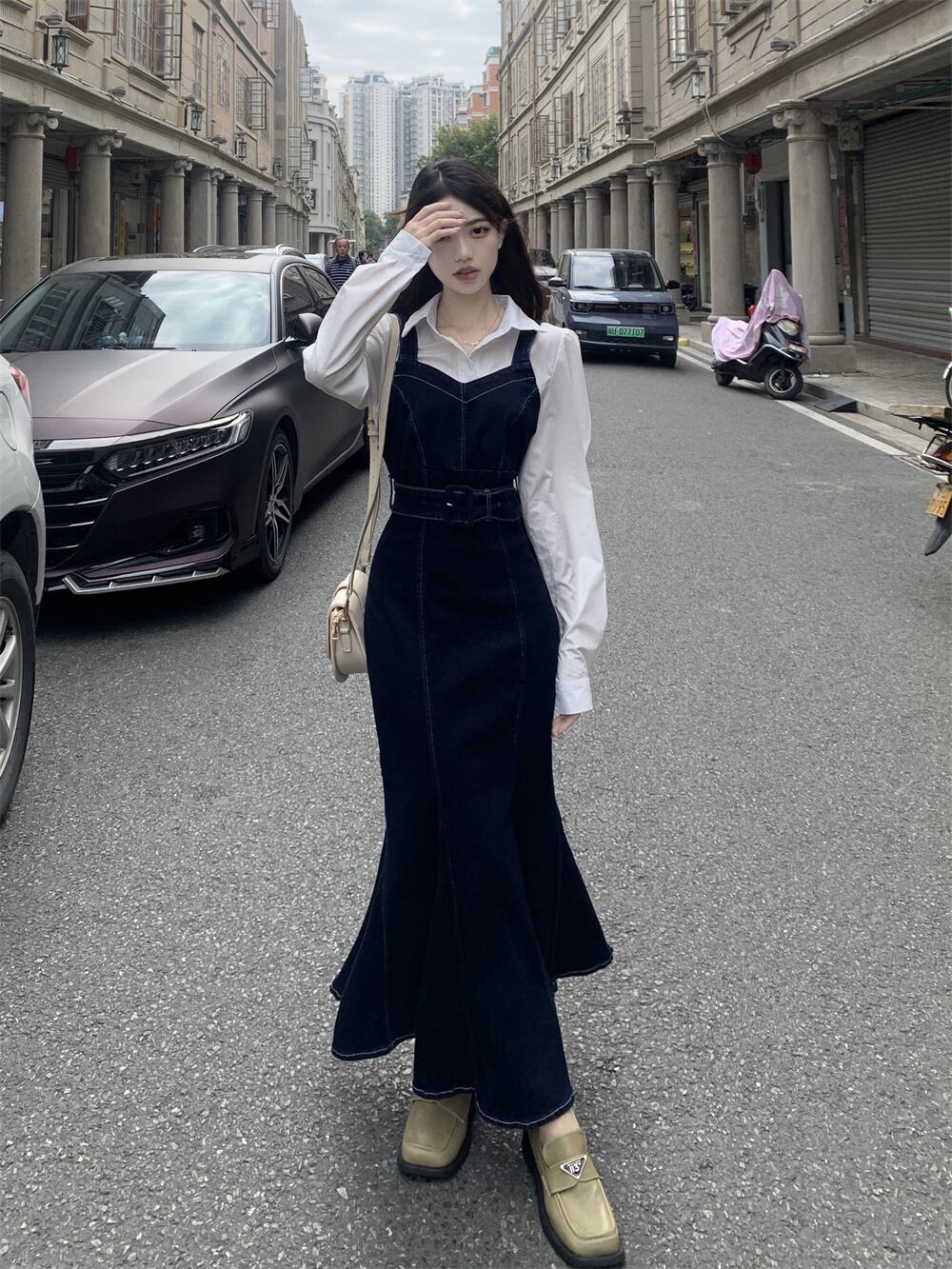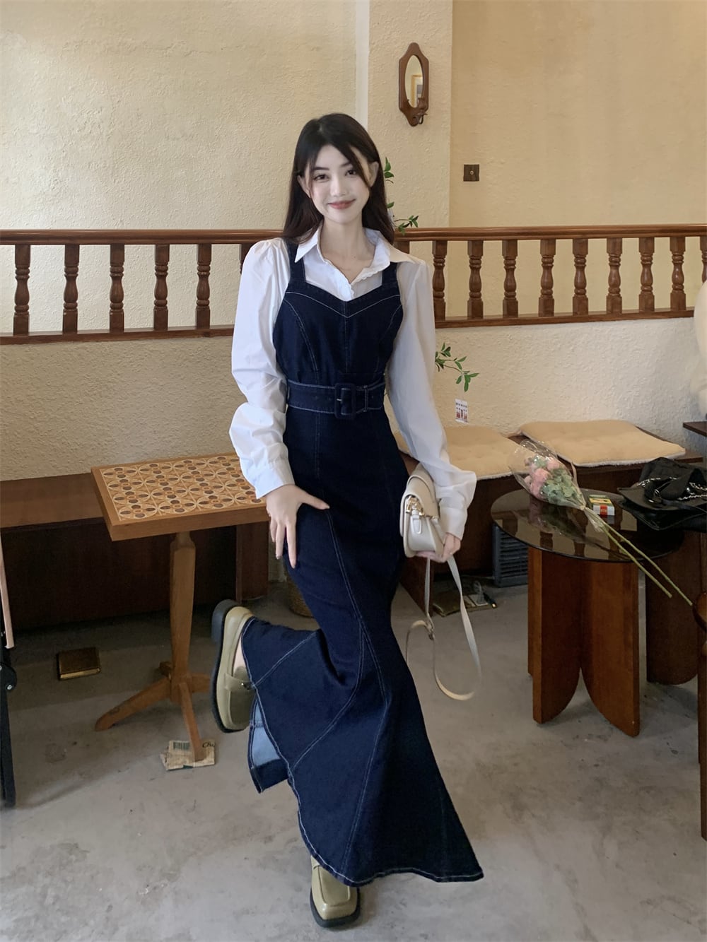 シャツとジャンパースカートのセットアップ。マーメイドラインのデニムスカートが可愛く、バックスリットが入っているのも特徴。