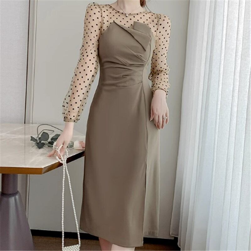 ドレス セクシードレス ミモレ ミモレ丈 袖あり 長袖 ラウンドネック Aライン スリット ハイウエスト メッシュ ドット かわいい 大人可愛い きれいめ シンプル 大人 上品 おしゃれ お洒落 大人可愛い ラブリー キュート ガーリー セクシー エレガント 華やか 上品 お姫様 お嬢様 清楚 20代 30代 40代 レディース デート 女子会 パーティー イベント レストラン 韓国 韓国系 オルチャン ファッション コーデ スタイル 美脚 夏 二次会 2次会 1.5次会