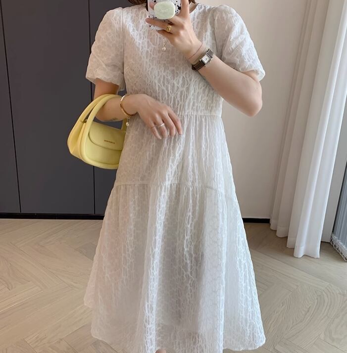 ドレス ミモレ丈ドレス ミモレ ミモレ丈 ロング ロング丈 袖あり 半袖 パフスリーブ ラウンドネック 襟なし Aライン シフォン フリル 透け感 シースルー 大人可愛い きれいめ シンプル 大人 上品 おしゃれ お洒落 こなれ感 ラフ キュート ガーリー ルーズ 個性的 セクシー 存在感 とろみ感 抜け感 無地 10代 20代 30代 レディース 女性用 学生 デート お出かけ 女子会 パーティー イベント 韓国系 体系カバー 脚長 春 夏 お呼ばれ パーティー M 白 ホワイト くすみカラー