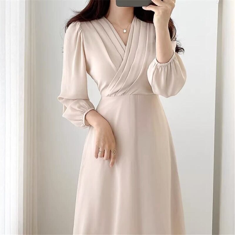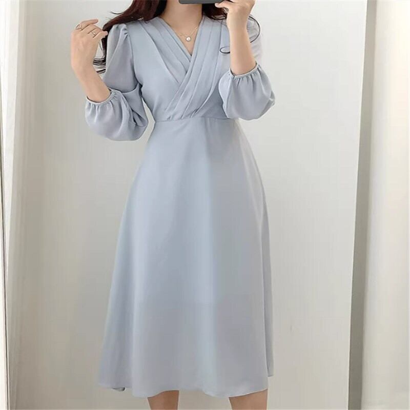 ドレス ロング ロング丈 袖あり 長袖 Vネック パフスリーブ Aライン シフォン ハイウエスト かわいい 大人可愛い きれいめ シンプル 大人 上品 おしゃれ お洒落 大人可愛い ラブリー キュート ガーリー セクシー エレガント ナチュラル 上品 無地 20代 30代 40代 レディース デート 女子会 パーティー イベント レストラン 韓国 韓国系 オルチャン ファッション コーデ 春 秋 二次会 2次会 1.5次会 お呼ばれ フリーサイズ 青 アプリコット