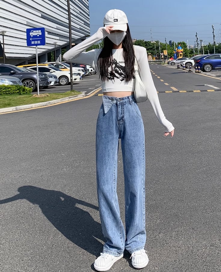 ハイウエストのレディースジーンズ。ストリート風のファッションを楽しみたいときに選びたいレトロでカジュアルなデザイン。