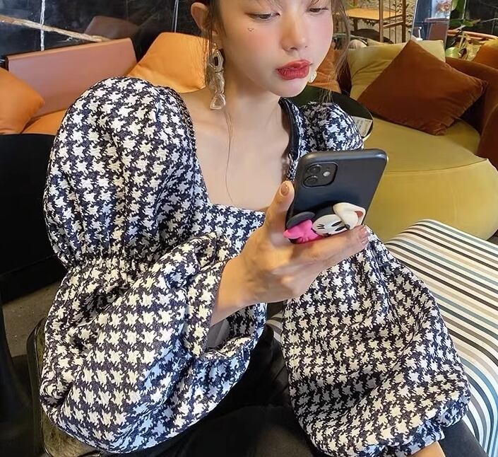 トップス シャツ ショート ショート丈 袖あり 長袖 ボリューム袖 パフスリーブ スクエアネック バックリボン 鎖骨 背中開き 大人可愛い きれいめ シンプル 上品 お洒落 レトロ 大人女子 ルーズ 個性的 セクシー エレガント モダン 存在感 ゆったり シック 柄 千鳥格子 春 秋 10代 20代 30代 レディース 女性用 学生 デート お出かけ 女子会 休日 パーティー イベント 旅行 着回し 普段使い 韓国系 フリーサイズ 白 ホワイト 黒 ブラック 大人カラー バイカラー モノトーン