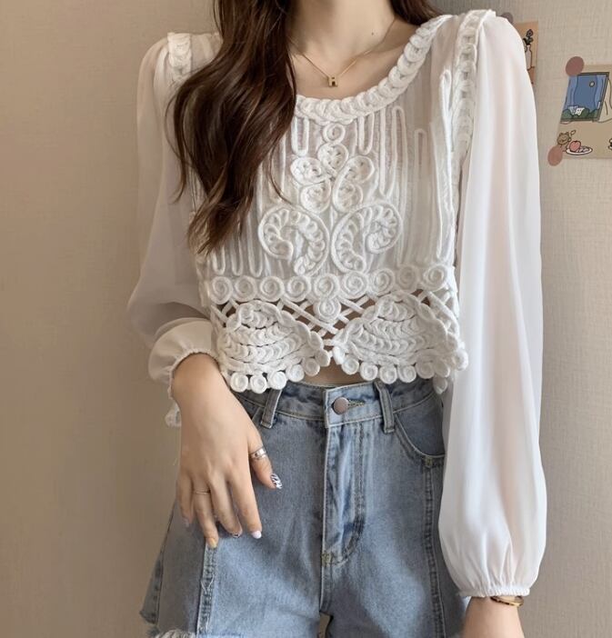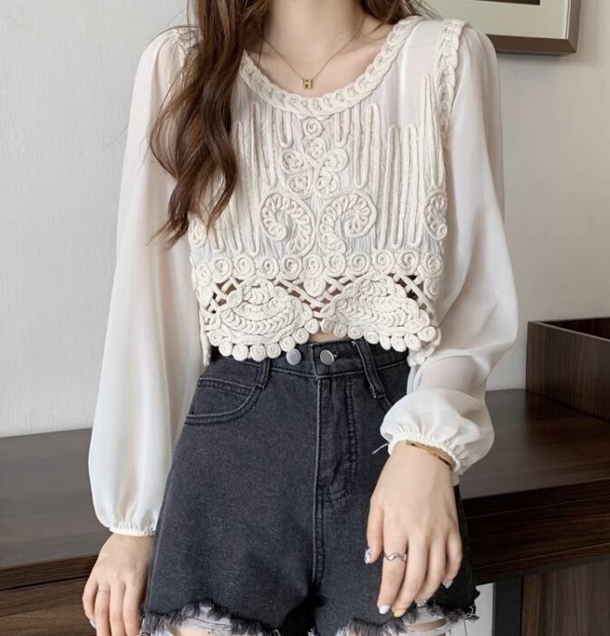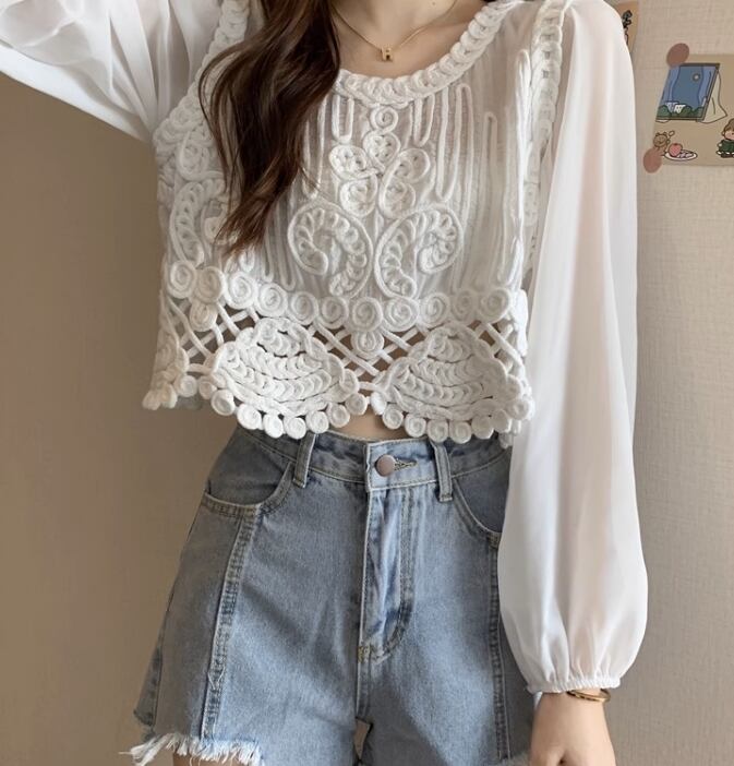 トップス ブラウス ミニ ミニ丈 袖あり 長袖 ラウンドネック レース ハイウエスト 透け感 鎖骨 かわいい 大人可愛い シンプル 上品 おしゃれ お洒落 レトロ ラフ マニッシュ キュート ルーズ 個性的 セクシー モダン 抜け感 シック ロマンチック 無地 春 夏 10代 20代 30代 レディース 女性用 学生 デート お出かけ お泊まり 休日 フリーサイズ 白 ホワイト くすみカラー 大人カラー モノトーン 春カラー アプリコット