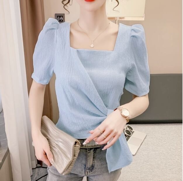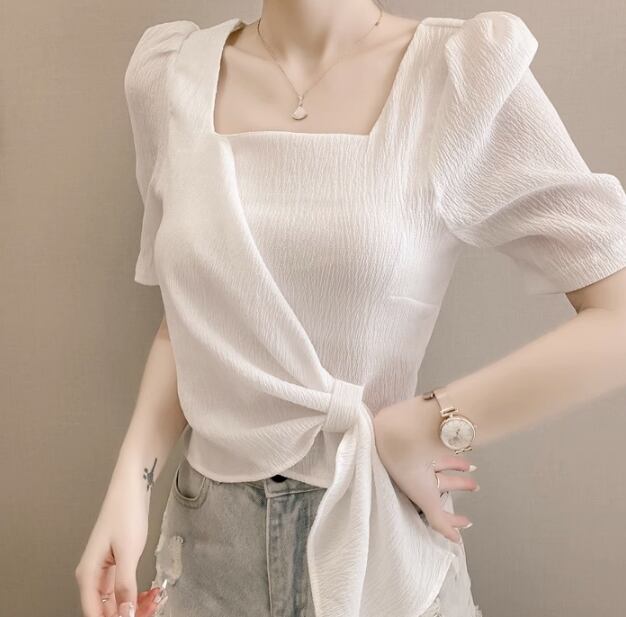 トップス シャツ ショート ショート丈 袖あり 半袖 パフスリーブ スクエアネック 襟なし アシンメトリー シフォン ドレープ 鎖骨 大人可愛い きれいめ シンプル 上品 おしゃれ お洒落 大人女子 こなれ感 キュート ルーズ セクシー エレガント モダン 主役級 存在感 抜け感 ロマンチック 無地 春 夏 10代 20代 レディース 女性用 学生 デート お出かけ 休日 着回し 普段使い 韓国系 S M L XL 白 ホワイト 青 ブルー パステルカラー 大人カラー