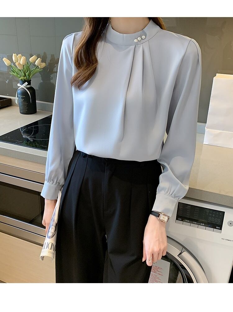 襟元のパールが可愛いスタンドカラーブラウスです!