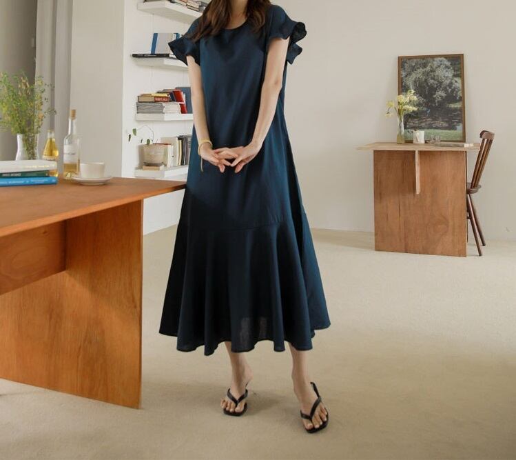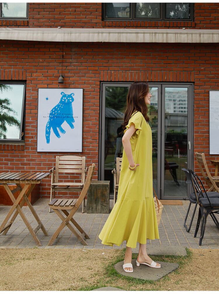 ワンピース フレアワンピース 膝下 ミモレ ミモレ丈 9分丈 アンクル丈 半袖 フレアスリーブ ラウンドネック ルーズ フレア ワイド 裾ワイド フリル ポケット プルオーバー 薄手 かわいい 大人可愛い シンプル カジュアル 大人 おしゃれ レトロ 無地 春 夏 秋 10代 20代 30代 40代 50代 レディース 学生 通学 デート お出かけ 女子会 休日 運動 アウトドア リゾート 旅行 ショッピング 普段使い 重ね着 体系カバー フリーサイズ ゆったり ゆる ワンサイズ ネイビー イエロー